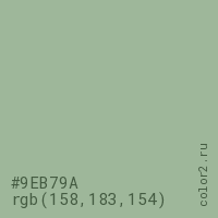 Цвет #9EB79A в цветовой модели RGB обозначается тремя октетами (158, 183, 154) в десятичном формате и #9EB79A в шестнадцатиричном (hex) формате, которые являются интенсивностью красного 158 (hex 9E), интенсивность зелёного 183 (hex B7) и интенсивность синего 154 (hex 9A).