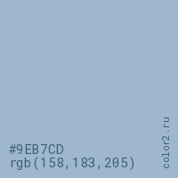 Цвет #9EB7CD в цветовой модели RGB обозначается тремя октетами (158, 183, 205) в десятичном формате и #9EB7CD в шестнадцатиричном (hex) формате, которые являются интенсивностью красного 158 (hex 9E), интенсивность зелёного 183 (hex B7) и интенсивность синего 205 (hex CD).