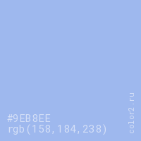 Цвет #9EB8EE в цветовой модели RGB обозначается тремя октетами (158, 184, 238) в десятичном формате и #9EB8EE в шестнадцатиричном (hex) формате, которые являются интенсивностью красного 158 (hex 9E), интенсивность зелёного 184 (hex B8) и интенсивность синего 238 (hex EE).