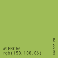 Цвет #9EBC56 в цветовой модели RGB обозначается тремя октетами (158, 188, 86) в десятичном формате и #9EBC56 в шестнадцатиричном (hex) формате, которые являются интенсивностью красного 158 (hex 9E), интенсивность зелёного 188 (hex BC) и интенсивность синего 86 (hex 56).