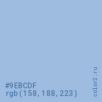 Цвет #9EBCDF в цветовой модели RGB обозначается тремя октетами (158, 188, 223) в десятичном формате и #9EBCDF в шестнадцатиричном (hex) формате, которые являются интенсивностью красного 158 (hex 9E), интенсивность зелёного 188 (hex BC) и интенсивность синего 223 (hex DF).