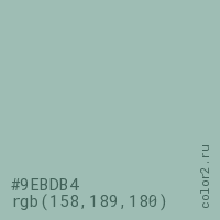 Цвет #9EBDB4 в цветовой модели RGB обозначается тремя октетами (158, 189, 180) в десятичном формате и #9EBDB4 в шестнадцатиричном (hex) формате, которые являются интенсивностью красного 158 (hex 9E), интенсивность зелёного 189 (hex BD) и интенсивность синего 180 (hex B4).