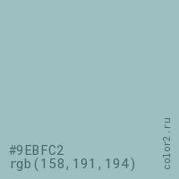 Цвет #9EBFC2 в цветовой модели RGB обозначается тремя октетами (158, 191, 194) в десятичном формате и #9EBFC2 в шестнадцатиричном (hex) формате, которые являются интенсивностью красного 158 (hex 9E), интенсивность зелёного 191 (hex BF) и интенсивность синего 194 (hex C2).