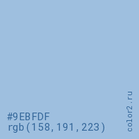 Цвет #9EBFDF в цветовой модели RGB обозначается тремя октетами (158, 191, 223) в десятичном формате и #9EBFDF в шестнадцатиричном (hex) формате, которые являются интенсивностью красного 158 (hex 9E), интенсивность зелёного 191 (hex BF) и интенсивность синего 223 (hex DF).