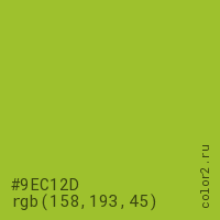 Цвет #9EC12D в цветовой модели RGB обозначается тремя октетами (158, 193, 45) в десятичном формате и #9EC12D в шестнадцатиричном (hex) формате, которые являются интенсивностью красного 158 (hex 9E), интенсивность зелёного 193 (hex C1) и интенсивность синего 45 (hex 2D).