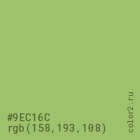 Цвет #9EC16C в цветовой модели RGB обозначается тремя октетами (158, 193, 108) в десятичном формате и #9EC16C в шестнадцатиричном (hex) формате, которые являются интенсивностью красного 158 (hex 9E), интенсивность зелёного 193 (hex C1) и интенсивность синего 108 (hex 6C).