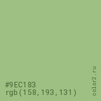 Цвет #9EC183 в цветовой модели RGB обозначается тремя октетами (158, 193, 131) в десятичном формате и #9EC183 в шестнадцатиричном (hex) формате, которые являются интенсивностью красного 158 (hex 9E), интенсивность зелёного 193 (hex C1) и интенсивность синего 131 (hex 83).