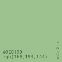 Цвет #9EC190 в цветовой модели RGB обозначается тремя октетами (158, 193, 144) в десятичном формате и #9EC190 в шестнадцатиричном (hex) формате, которые являются интенсивностью красного 158 (hex 9E), интенсивность зелёного 193 (hex C1) и интенсивность синего 144 (hex 90).