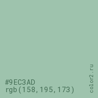 Цвет #9EC3AD в цветовой модели RGB обозначается тремя октетами (158, 195, 173) в десятичном формате и #9EC3AD в шестнадцатиричном (hex) формате, которые являются интенсивностью красного 158 (hex 9E), интенсивность зелёного 195 (hex C3) и интенсивность синего 173 (hex AD).