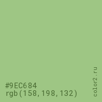 Цвет #9EC684 в цветовой модели RGB обозначается тремя октетами (158, 198, 132) в десятичном формате и #9EC684 в шестнадцатиричном (hex) формате, которые являются интенсивностью красного 158 (hex 9E), интенсивность зелёного 198 (hex C6) и интенсивность синего 132 (hex 84).
