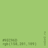 Цвет #9EC96D в цветовой модели RGB обозначается тремя октетами (158, 201, 109) в десятичном формате и #9EC96D в шестнадцатиричном (hex) формате, которые являются интенсивностью красного 158 (hex 9E), интенсивность зелёного 201 (hex C9) и интенсивность синего 109 (hex 6D).