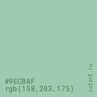 Цвет #9ECBAF в цветовой модели RGB обозначается тремя октетами (158, 203, 175) в десятичном формате и #9ECBAF в шестнадцатиричном (hex) формате, которые являются интенсивностью красного 158 (hex 9E), интенсивность зелёного 203 (hex CB) и интенсивность синего 175 (hex AF).