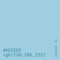 Цвет #9ECEDF в цветовой модели RGB обозначается тремя октетами (158, 206, 223) в десятичном формате и #9ECEDF в шестнадцатиричном (hex) формате, которые являются интенсивностью красного 158 (hex 9E), интенсивность зелёного 206 (hex CE) и интенсивность синего 223 (hex DF).