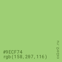 Цвет #9ECF74 в цветовой модели RGB обозначается тремя октетами (158, 207, 116) в десятичном формате и #9ECF74 в шестнадцатиричном (hex) формате, которые являются интенсивностью красного 158 (hex 9E), интенсивность зелёного 207 (hex CF) и интенсивность синего 116 (hex 74).