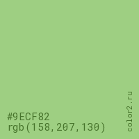 Цвет #9ECF82 в цветовой модели RGB обозначается тремя октетами (158, 207, 130) в десятичном формате и #9ECF82 в шестнадцатиричном (hex) формате, которые являются интенсивностью красного 158 (hex 9E), интенсивность зелёного 207 (hex CF) и интенсивность синего 130 (hex 82).