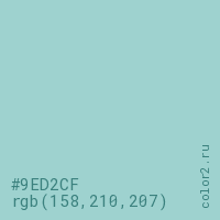 Цвет #9ED2CF в цветовой модели RGB обозначается тремя октетами (158, 210, 207) в десятичном формате и #9ED2CF в шестнадцатиричном (hex) формате, которые являются интенсивностью красного 158 (hex 9E), интенсивность зелёного 210 (hex D2) и интенсивность синего 207 (hex CF).