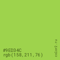 Цвет #9ED34C в цветовой модели RGB обозначается тремя октетами (158, 211, 76) в десятичном формате и #9ED34C в шестнадцатиричном (hex) формате, которые являются интенсивностью красного 158 (hex 9E), интенсивность зелёного 211 (hex D3) и интенсивность синего 76 (hex 4C).