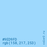 Цвет #9ED9FD в цветовой модели RGB обозначается тремя октетами (158, 217, 253) в десятичном формате и #9ED9FD в шестнадцатиричном (hex) формате, которые являются интенсивностью красного 158 (hex 9E), интенсивность зелёного 217 (hex D9) и интенсивность синего 253 (hex FD).