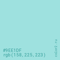 Цвет #9EE1DF в цветовой модели RGB обозначается тремя октетами (158, 225, 223) в десятичном формате и #9EE1DF в шестнадцатиричном (hex) формате, которые являются интенсивностью красного 158 (hex 9E), интенсивность зелёного 225 (hex E1) и интенсивность синего 223 (hex DF).