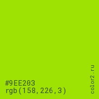 Цвет #9EE203 в цветовой модели RGB обозначается тремя октетами (158, 226, 3) в десятичном формате и #9EE203 в шестнадцатиричном (hex) формате, которые являются интенсивностью красного 158 (hex 9E), интенсивность зелёного 226 (hex E2) и интенсивность синего 3 (hex 03).
