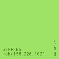 Цвет #9EE266 в цветовой модели RGB обозначается тремя октетами (158, 226, 102) в десятичном формате и #9EE266 в шестнадцатиричном (hex) формате, которые являются интенсивностью красного 158 (hex 9E), интенсивность зелёного 226 (hex E2) и интенсивность синего 102 (hex 66).