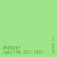 Цвет #9EE387 в цветовой модели RGB обозначается тремя октетами (158, 227, 135) в десятичном формате и #9EE387 в шестнадцатиричном (hex) формате, которые являются интенсивностью красного 158 (hex 9E), интенсивность зелёного 227 (hex E3) и интенсивность синего 135 (hex 87).
