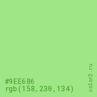 Цвет #9EE686 в цветовой модели RGB обозначается тремя октетами (158, 230, 134) в десятичном формате и #9EE686 в шестнадцатиричном (hex) формате, которые являются интенсивностью красного 158 (hex 9E), интенсивность зелёного 230 (hex E6) и интенсивность синего 134 (hex 86).