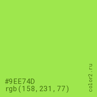 Цвет #9EE74D в цветовой модели RGB обозначается тремя октетами (158, 231, 77) в десятичном формате и #9EE74D в шестнадцатиричном (hex) формате, которые являются интенсивностью красного 158 (hex 9E), интенсивность зелёного 231 (hex E7) и интенсивность синего 77 (hex 4D).