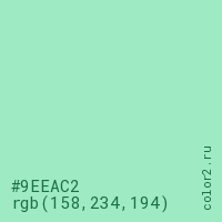 Цвет #9EEAC2 в цветовой модели RGB обозначается тремя октетами (158, 234, 194) в десятичном формате и #9EEAC2 в шестнадцатиричном (hex) формате, которые являются интенсивностью красного 158 (hex 9E), интенсивность зелёного 234 (hex EA) и интенсивность синего 194 (hex C2).