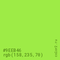 Цвет #9EEB46 в цветовой модели RGB обозначается тремя октетами (158, 235, 70) в десятичном формате и #9EEB46 в шестнадцатиричном (hex) формате, которые являются интенсивностью красного 158 (hex 9E), интенсивность зелёного 235 (hex EB) и интенсивность синего 70 (hex 46).