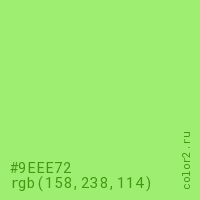 Цвет #9EEE72 в цветовой модели RGB обозначается тремя октетами (158, 238, 114) в десятичном формате и #9EEE72 в шестнадцатиричном (hex) формате, которые являются интенсивностью красного 158 (hex 9E), интенсивность зелёного 238 (hex EE) и интенсивность синего 114 (hex 72).