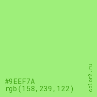 Цвет #9EEF7A в цветовой модели RGB обозначается тремя октетами (158, 239, 122) в десятичном формате и #9EEF7A в шестнадцатиричном (hex) формате, которые являются интенсивностью красного 158 (hex 9E), интенсивность зелёного 239 (hex EF) и интенсивность синего 122 (hex 7A).
