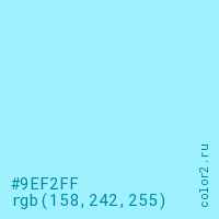 Цвет #9EF2FF в цветовой модели RGB обозначается тремя октетами (158, 242, 255) в десятичном формате и #9EF2FF в шестнадцатиричном (hex) формате, которые являются интенсивностью красного 158 (hex 9E), интенсивность зелёного 242 (hex F2) и интенсивность синего 255 (hex FF).