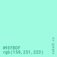 Цвет #9EFBDF в цветовой модели RGB обозначается тремя октетами (158, 251, 223) в десятичном формате и #9EFBDF в шестнадцатиричном (hex) формате, которые являются интенсивностью красного 158 (hex 9E), интенсивность зелёного 251 (hex FB) и интенсивность синего 223 (hex DF).