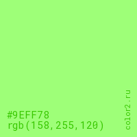 Цвет #9EFF78 в цветовой модели RGB обозначается тремя октетами (158, 255, 120) в десятичном формате и #9EFF78 в шестнадцатиричном (hex) формате, которые являются интенсивностью красного 158 (hex 9E), интенсивность зелёного 255 (hex FF) и интенсивность синего 120 (hex 78).