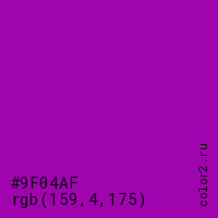 Цвет #9F04AF в цветовой модели RGB обозначается тремя октетами (159, 4, 175) в десятичном формате и #9F04AF в шестнадцатиричном (hex) формате, которые являются интенсивностью красного 159 (hex 9F), интенсивность зелёного 4 (hex 04) и интенсивность синего 175 (hex AF).