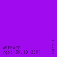 Цвет #9F0AEF в цветовой модели RGB обозначается тремя октетами (159, 10, 239) в десятичном формате и #9F0AEF в шестнадцатиричном (hex) формате, которые являются интенсивностью красного 159 (hex 9F), интенсивность зелёного 10 (hex 0A) и интенсивность синего 239 (hex EF).
