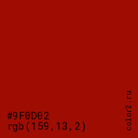 Цвет #9F0D02 в цветовой модели RGB обозначается тремя октетами (159, 13, 2) в десятичном формате и #9F0D02 в шестнадцатиричном (hex) формате, которые являются интенсивностью красного 159 (hex 9F), интенсивность зелёного 13 (hex 0D) и интенсивность синего 2 (hex 02).