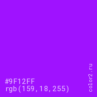 Цвет #9F12FF в цветовой модели RGB обозначается тремя октетами (159, 18, 255) в десятичном формате и #9F12FF в шестнадцатиричном (hex) формате, которые являются интенсивностью красного 159 (hex 9F), интенсивность зелёного 18 (hex 12) и интенсивность синего 255 (hex FF).