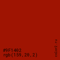 Цвет #9F1402 в цветовой модели RGB обозначается тремя октетами (159, 20, 2) в десятичном формате и #9F1402 в шестнадцатиричном (hex) формате, которые являются интенсивностью красного 159 (hex 9F), интенсивность зелёного 20 (hex 14) и интенсивность синего 2 (hex 02).