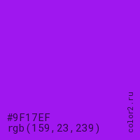 Цвет #9F17EF в цветовой модели RGB обозначается тремя октетами (159, 23, 239) в десятичном формате и #9F17EF в шестнадцатиричном (hex) формате, которые являются интенсивностью красного 159 (hex 9F), интенсивность зелёного 23 (hex 17) и интенсивность синего 239 (hex EF).