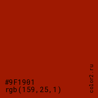 Цвет #9F1901 в цветовой модели RGB обозначается тремя октетами (159, 25, 1) в десятичном формате и #9F1901 в шестнадцатиричном (hex) формате, которые являются интенсивностью красного 159 (hex 9F), интенсивность зелёного 25 (hex 19) и интенсивность синего 1 (hex 01).