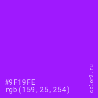 Цвет #9F19FE в цветовой модели RGB обозначается тремя октетами (159, 25, 254) в десятичном формате и #9F19FE в шестнадцатиричном (hex) формате, которые являются интенсивностью красного 159 (hex 9F), интенсивность зелёного 25 (hex 19) и интенсивность синего 254 (hex FE).