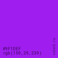 Цвет #9F1DEF в цветовой модели RGB обозначается тремя октетами (159, 29, 239) в десятичном формате и #9F1DEF в шестнадцатиричном (hex) формате, которые являются интенсивностью красного 159 (hex 9F), интенсивность зелёного 29 (hex 1D) и интенсивность синего 239 (hex EF).