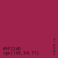 Цвет #9F224D в цветовой модели RGB обозначается тремя октетами (159, 34, 77) в десятичном формате и #9F224D в шестнадцатиричном (hex) формате, которые являются интенсивностью красного 159 (hex 9F), интенсивность зелёного 34 (hex 22) и интенсивность синего 77 (hex 4D).