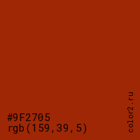 Цвет #9F2705 в цветовой модели RGB обозначается тремя октетами (159, 39, 5) в десятичном формате и #9F2705 в шестнадцатиричном (hex) формате, которые являются интенсивностью красного 159 (hex 9F), интенсивность зелёного 39 (hex 27) и интенсивность синего 5 (hex 05).