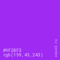 Цвет #9F2BF3 в цветовой модели RGB обозначается тремя октетами (159, 43, 243) в десятичном формате и #9F2BF3 в шестнадцатиричном (hex) формате, которые являются интенсивностью красного 159 (hex 9F), интенсивность зелёного 43 (hex 2B) и интенсивность синего 243 (hex F3).