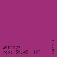 Цвет #9F2D77 в цветовой модели RGB обозначается тремя октетами (159, 45, 119) в десятичном формате и #9F2D77 в шестнадцатиричном (hex) формате, которые являются интенсивностью красного 159 (hex 9F), интенсивность зелёного 45 (hex 2D) и интенсивность синего 119 (hex 77).