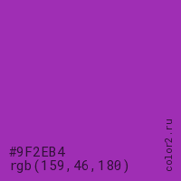 Цвет #9F2EB4 в цветовой модели RGB обозначается тремя октетами (159, 46, 180) в десятичном формате и #9F2EB4 в шестнадцатиричном (hex) формате, которые являются интенсивностью красного 159 (hex 9F), интенсивность зелёного 46 (hex 2E) и интенсивность синего 180 (hex B4).