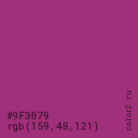Цвет #9F3079 в цветовой модели RGB обозначается тремя октетами (159, 48, 121) в десятичном формате и #9F3079 в шестнадцатиричном (hex) формате, которые являются интенсивностью красного 159 (hex 9F), интенсивность зелёного 48 (hex 30) и интенсивность синего 121 (hex 79).
